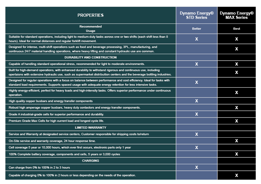 Saída de energia confiável: As baterias de lítio para empilhadeiras Dynamo Energy® garantem energia estável e tensão consistente durante todo o ciclo de carga. Ao contrário das baterias de chumbo-ácido, que sofrem um declínio na potência à medida que a sua carga se esgota, as nossas baterias de lítio mantêm um desempenho ideal durante longos turnos.